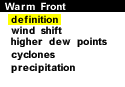 ![]() Symbolically, a warm front is represented by a solid line with semicircles pointing towards the colder air and in the direction of movement. On colored weather maps, a warm front is drawn with a solid red line. ![]() There is typically a noticeable temperature change from one side of the warm front to the other. In the map of surface temperatures below, the station north of the front reported a temperature of 53 degrees Fahrenheit while a short distance behind the front, the temperature increased to 71 degrees. An abrupt temperature change over a short distance is a good indication that a front is located somewhere in between.