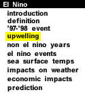 One oceanic process altered during an El Niño year is upwelling, which is the rising of deeper colder water to shallower depths. The diagram below shows how upwelling occurs along the coast of Peru. Because of the frictional stresses that exist between ocean layers, surface water is transported at a 90 degree angle to the left of the winds in the southern hemisphere, 90 degrees to the right of the winds in the northern hemisphere. This is why winds blowing northward parallel to the coastline of Peru "drag" surface water westward away from shore.