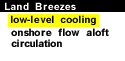 On clear, calm evenings, temperature differences between a body of water and neighboring land produce a cool wind that blows offshore. This wind is called a "land breeze". Land breezes are strongest along the immediate coastline but weaken considerably further inland.