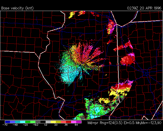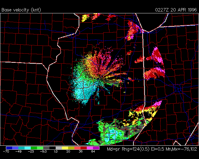 These are Radar Velocity images from the NEXRad site ILX in Lincoln, Illinois. Images are accessible through the links below and are given in Universal Time Coordinates (UTC).