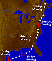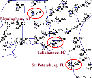 This is an example of how the scaffolding activities can be used to help you complete your project accurately. An example of the data collection process is given below. The cities circled in red belong to Group #1; Birmingham, Tallahassee and St. Petersburg. For each city, the data for temperature, dew point temperature, winds and weather (or precipitation) have been recorded. For the cities chosen, collect similar pieces of data during the time period beginning 1200Z 12 March and ending on 0900 14 March, 1993. Record the data at two hour intervals (every other hour). The surface maps are accessible in the SuperStorm '93 Archives. There are four regional views of surface weather data and they include: Continental United States, Northeast, Middle Atlantic and Southeast. Select the region that allows the best view of the data for the cities you've chosen.
