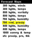 This panel shows the forecasted fields for 700 mb vertical velocities and quantitative precipitation. 700 mb charts depict conditions in the middle troposphere (roughly 3000 meters). This is also referred to as the steering level, since most weather systems are "steered" by the winds at this level. 700 mb vertical velocity is simply the velocity of air moving through the 700 mb surface in a vertical direction. Upward motion has a positive velocity (solid white contours) and downward motion has a negative velocity (dashed white contours). The vertical velocity field is given in millibars per second with an interval of 2 millibars per second between velocity contours. Quantitative precipitation is represented by the color filled regions and the associated values are indicated by the color code located in the lower left corner of the forecast panel. Precipitation totals are given in inches with totals of less than 0.51 inches shaded in purple with heavier totals shaded in green, yellow and red. Quantitative precipitation is the estimation of the liquid equivalent precipitation that would occur during the 12 hour period. For example, quantitative precipitation fields for 0000Z 24 March 1996 represent the amount of precipitation that is predicted to occur from 1200Z 23 March to 0000Z 24 March 1996. In this particular image, the important feature is the line of quantitative precipitation extending from Wisconsin southwestward into Arkansas and Texas. This line of precipitation is likely caused by a cold front. The vertical velocity is maximized further east of the quantitative precipitation maxima. This means that the areas of precipitation should move eastward with the advancing cold front. Precipitation is a result of rising air and in regions where values of vertical velocity is greater than 5 mb/second, precipitation is likely to occur. Generally the areas of strongest precipitation are associated with the strongest upward motion. It is important to note that the quantitative precipitation field is depicts precipitation that has fallen in the past 12 hours. The vertical velocity field is valid for the time shown in the image. Therefore, the upward motion shows where precipitation is forming or will likely form in the near future and where precipitation will likely move. Downward motion, however, tends to suppress vertical development of clouds and precipitation, resulting in fair weather conditions.