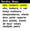 The surface meteorological chart above depicts the current surface conditions at chosen sights across North America. This map, updated shortly after each hour, illustrates the present weather patterns and the location of storm systems over the continental United States. The hourly observations (updated every hour) contain information about surface temperature and dew point temperature in degrees Fahrenheit, sea level pressure, wind speed and direction, cloud cover, and type of weather conditions occurring at each surface station during the last hour. The hourly observations link provides detailed information on how to decode and interpret the numbers and symbols at each station. The blue contours called isobars and depict areas of High and Low pressure. In the background, radar reflectivity data depict areas of precipitation occurring during the past hour. The strongest echoes (refer to the color scale) during the warm season indicate areas of intense rain and/or hail, generally associated with deep convection. For more information about the radar data refer to radar images. The low pressure centers over United States are often referred to as midlatitude cyclones and can be identified as a minimum in the pressure field, and an area of cyclonic circulation of the surface flow. These storm systems are typically characterized by cloud cover in the vicinity of the low pressure center, relatively warm and moist flow with a southerly component ahead of the cold front and colder and drier airmass behind it, as well as areas of precipitation associated with both warm and cold fronts.