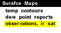 The surface meteorological chart above depicts the current surface conditions at chosen sights across North America. This map, updated shortly after each hour, illustrates the present weather patterns and the location of storm systems over the continental United States. The hourly observations (updated every hour) contain information about surface temperature and dew point temperature in degrees Fahrenheit, sea level pressure, wind speed and direction, cloud cover and type of weather conditions occurring at each surface station during the last hour. The hourly observations link provides detailed information on how to decode and interpret the numbers and symbols at each station. The blue contours called isobars and depict areas of High and Low pressure. In the background, infrared satellite data shows the cloud patterns over North America. The brightness of the cloud images is inversely proportional to the temperature of cloud tops, therefore the deep clouds with high (and thus cold) cloud tops typically indicating areas of intense rain and/or hail associated with deep convection appear brightest on this image. However high cirrus clouds will often also appear very bright, but these clouds do not produce precipitation. One can attempt to relate the areas of cloudiness to the pressure pattern and the areas of precipitation depicted by the radar data (previous panel). Clouds and precipitation tend to be associated with low pressure systems also known as midlatitude cyclones. Midlatitude cyclones can be identified as a minimum in the pressure field, and an area of cyclonic circulation of the surface flow. These storm systems are typically characterized by cloud cover in the vicinity of the low pressure center, relatively warm and moist flow with a southerly component ahead of the cold front and colder and drier airmass behind it, as well as areas of precipitation associated with both warm and cold fronts.