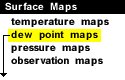 This surface meteorological chart shows the dew point temerature pattern (in degrees Fahrenheit) over the continental United States and is updated every hour. Dew point temperature is a measure of moisture in the air and is contoured here every 5 degrees. When the dew point temperature is close to the temperature of the air, the air is nearly saturated. However, nearly saturated air is not always humid. Only when the temperatures reach above 70 degrees Fahrenheit and dew points rise nearly as high does the air feel "muggy" and uncomfortable. Humidity of the air generally increases southward, similarly to the temperatures. During the summer dark green shading (dew points in the 60s or higher) indicate humid air. Dew points in the 40s or lower (light green, yellow or white) are considered dry. In the winter the dew points are on average 30-40 degrees lower, similarly to the temperatures (except the southern coastal regions where the fluctuations are a little smaller). In the example above on the left, there is a large change in dew point temperature from New Mexico to central Texas. This suggests that a dry line is somewhere in the area. You can check the current map (above right) to see is there are areas that also appear to be affected by dry lines. Humidity decreases the convective stability of the air. Since the density of moist air is lower it tends to rise over colder, denser air. This can happen along a frontal boundary or if air becomes convectively unstable and rises to form clouds and precipitation. This is why thunderstorms and convective showers often form in a warm, moist airmass. Sharp gradients (closely packed dew point contours) are often indicative of frontal boundaries or dry lines. During the warm season intense precipitation often occurs along those boundaries.