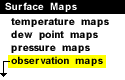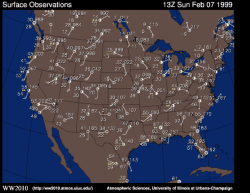 The surface meteorological charts above depict the current surface conditions at chosen sites across North America. The hourly observations (updated every hour) contain information about surface temperature and dew point temperature in degrees Fahrenheit, sea level pressure, wind speed and direction, cloud cover and type of weather conditions occurring at each surface station during the last hour. The hourly observations link provides detailed information on how to decode and interpret the numbers and symbols at each station.