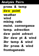 ![]() Example Pressure and Dew point Distribution This panel depicts sea-level pressure and dew point temperature. This chart is useful for finding fronts and high and low pressure systems. The solid white contours represent pressure contours (isobars) in millibars. The isobars have a contour interval of four millibars. The wind speed is directly related to the distance between the isobars. The closer the isobars are together, the stronger the pressure gradient, and the stronger the wind. The dashed green lines represent lines of equal dew point (isodrosotherms). The contour interval of the dew point contours is two degrees Fahrenheit. From the map above you can sometimes find warm fronts, cold fronts, and drylines. Fronts are usually located where the dew point changes drastically over a short distance. A dryline is also an area where dew point changes dramatically over a short distance. This image is a rare example of a very strong dryline (coldfront) across the Midwest. Dew points dropped over twenty degrees behind the front within a matter of a few hours. This preceded the tornado outbreak on July 2, 1997 that hit parts of Michigan, Indiana and Ohio. For more information on how pressure affects the weather go to our pressure module.
