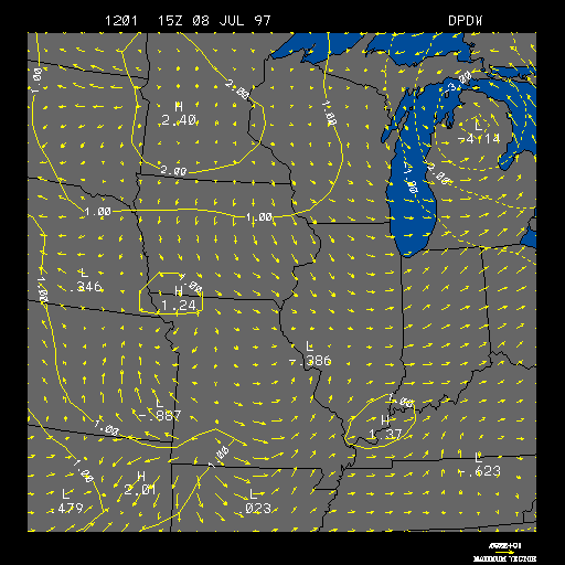 Positive pressure change areas are contoured in solid yellow lines and indicate that the pressure is rising. Negative pressure change areas are contoured in dashed yellow lines and indicate that the pressure is falling. Both pressure change areas are contoured in intervals of one millibar. Therefore, a positive pressure change contour of 2 would indicate that the pressure has risen by 2 millibars in the past 3 hours within that contour. The 3 hour wind change is represented by wind vectors in units of meters per second, as indicated by the length of each wind vector. The wind vectors also show the change in wind direction during the past 3 hours, as indicated by the direction the arrow is pointing. The length and magnitude of the strongest wind vector is shown in the lower right-hand corner. This image is useful since low pressure systems (i.e., cyclones) tend to move to regions of the greatest negative pressure changes (where the pressure is falling most rapidly) and high pressure systems tend to move to regions of the greatest positive pressure changes (where the pressure is rising most rapidly). Therefore, from this image one can predict the direction that the low or high pressure systems will likely travel. Also, one can estimate whether or not the system is strengthening or weakening by examining the pressure change. For example, if there is a large drop in pressure ahead of a cyclone, that would indicate that the cyclone is increasing in strength (or as meteorologists say, "the cyclone is deepening"). The 3 hour wind changes can help to show the location of fronts, since one characteristic of both cold and warm fronts is a change in wind direction across the front. The example image above shows an area of negative pressure change located in Michigan and an area of positive pressure change in Minnesota. These pressure change areas are indications that a low pressure system is moving from Minnesota towards Michigan. An increase in the westerly winds can be found between the pressure change areas, which is an indication that a cold front is passing through that area.
