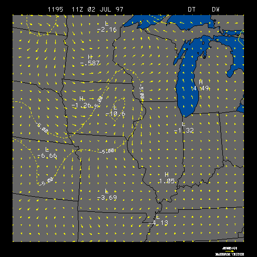 Positive temperature change areas are contoured in solid yellow lines and indicate that the temperature is rising in that region. Negative temperature change areas are contoured in dashed yellow lines and indicate that the temperature is falling in that region. Both temperature change areas are contoured in intervals of 5 degrees Fahrenheit. Therefore, a positive temperature change contour of 5 would indicate that the temperature has risen by 5 degrees Fahrenheit in the past 3 hours within that contour. The 3 hour wind change is represented by wind vectors in units of meters per second, as indicated by the length of each wind vector. The wind vectors also show the change in wind direction during the past 3 hours, as indicated by the direction the arrow is pointing. The length and magnitude of the strongest wind vector is shown in the lower right-hand corner.