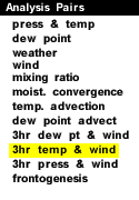 The 3 hour wind change can help show the location of fronts, since one characteristic of both cold and warm fronts is a change in wind direction across the front. The example image above shows an area of negative temperature change and an increase in the westerly winds located in Iowa. Both of these features are indications that a cold front has passed through the area.