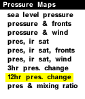 Positive pressure change areas are contoured in warm colors and indicate that the pressure is rising. Negative pressure change areas are contoured in dashed cool colors and indicate that the pressure is falling. Both pressure change areas are contoured in intervals of one millibar. Therefore, a positive pressure change contour of 2 would indicate that the pressure has risen by 2 millibars in the past 12 hours within that contour. This image is useful since low pressure systems (i.e., cyclones) tend to move to regions of the greatest negative pressure changes (where the pressure is falling most rapidly) and high pressure systems tend to move to regions of the greatest positive pressure changes (where the pressure is rising most rapidly). Therefore, from this image one can predict the direction that the low or high pressure systems will likely travel. Also, one can estimate whether or not the system is strengthening or weakening by examining the pressure change. For example, if there is a large drop in pressure ahead of a cyclone, that would indicate that the cyclone is increasing in strength (or as meteorologists say, "the cyclone is deepening").