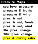 These panels depict sea-level pressure and mixing ratio. This chart is useful for finding high and low pressure systems. Its also useful for showing regions of moist air at the surface. The solid white contours represent pressure contours (isobars) in millibars. The isobars have a contour interval of four millibars. The wind speed is directly related to the distance between the isobars. The closer the isobars are together, the stronger the pressure gradient, and the stronger the wind. The color filled region on the background represent lines of equal mixing ratio. Mixing ratio has a contour interval of two grams per kilogram. Mixing ratio is another convenient way to express humidity, or atmospheric moisture. Mixing ratio is the mass of the water vapor in a specific volume to the mass of the remaining dry air. Another way to express that is Mixing ratio = mass of water vapor / mass of dry air. The units are grams per kilogram. Example: If you have a mixing ratio of 5, that means you have 5 grams of water vapor to every kilogram of dry air. From the map above you can sometimes find warm fronts, cold fronts, and drylines. Fronts are usually located where the mixing ratio changes drastically over a short distance. A dryline is also an area where mixing ratio changes drastically over a short distance. During the day, temperatures are warmer west of the dryline and at night they are warmer on the east. Drylines can usually be found in the Plains during the development of low pressure systems. For more information on how pressure affects the weather go to our forces and winds module.