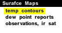 This surface meteorological chart shows the temperature pattern (in degrees Fahrenheit) over the continental United Sates and is updated every hour. Surface temperature reported at each station are contoured every five degrees Fahrenheit. Areas of warm and hot temperatures are depicted by orange and red colors and cold temperatures (below freezing) are shaded blue and purple. Areas of sharp temperature gradients (several contours close to each other) tend to be associated with the position of surface fronts. Fronts separate airmasses of different temperature and moisture (and therefore density) characteristics. In the example above on the left, there is a large change in temperature from western Oklahoma to central Texas. This suggests that a front is somewhere in the area. You can check the current map (above right) to see is there are areas that also appear to be affected by fronts.