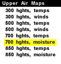 This panel shows the latest 700 mb field for geopotential height, winds, and dew point depression. 700 mb charts depict conditions in the middle troposphere (roughly 3000 meters). This is also referred to as the steering level, since most weather systems are "steered" by the winds at this level. Geopotential height approximates the actual height of a pressure surface above mean sea-level and is represented by the solid white contours. The geopotential height field is given in meters with an interval of 30 meters between height lines. The locations of surface cyclones and anticyclones hold similar positions in the 700 mb geopotential height field. Wind vectors indicate wind direction and wind speed and are drawn here as tiny white arrows. Wind vectors point towards the direction in which the wind is blowing and the longer the wind vector, the stronger the wind. The unit of magnitude for wind speed as depicted by the wind vectors is meters per second. Dew point depression is represented by the color filled regions and the associated values are indicated by the color code located in the lower left corner of the forecast panel. Dew point depression is defined as the difference between the dew point temperature and the actual temperature. Regions of moist air are identified by smaller dew point depression values, while greater values indicate drier air. The greater the dew point depression (more negative), the more moist the air, which is precursor for the development of clouds and precipitation.