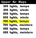 latest image This panel shows the 700 mb field for geopotential height, and temperature. 700 mb charts depict conditions in the middle troposphere (roughly 3000 meters). This is also referred to as the steering level, since most weather systems are "steered" by the winds at this level. Geopotential height approximates the actual height of a pressure surface above mean sea-level and is represented by the solid white contours. The geopotential height field is given in meters with an interval of 30 meters between height lines. The locations of surface cyclones and anticyclones hold similar positions in the 700 mb geopotential height field. Temperature is represented by contour lines which are labeled. Temperatures are given in degrees Celsius with an interval of 5 degrees Celsius between temperature contours, also called isotherms.