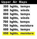 This panel shows the most recent 850 mb fields for geopotential height, dew point depression and wind vectors. 850 mb charts depict conditions in the lower troposphere (roughly 1500 meters). Geopotential height approximates the actual height of a pressure surface above mean sea-level and is represented by the solid white contours. The geopotential height field is given in meters with an interval of 30 meters between height lines. The locations of surface cyclones and anticyclones hold similar positions in the 850 mb geopotential height field. Wind vectors provide information about wind direction and wind speed and are drawn here as tiny white arrows. Wind vectors point towards the direction in which the wind is blowing and the longer the wind vector, the stronger the wind. The unit of magnitude for wind speed as depicted by the wind vectors is meters per second. Dew point depression, a measure of relative humidity, is represented by the color filled regions and the associated values are indicated by the color code located in the lower left corner of the forecast panel. Dew point depressions are given as the difference between the dew point temperatures and the actual temperatures. The lower the dew point depression, the more moist the air, which is vital for the development of clouds and precipitation. Advection of heat and moisture along the 850mb surface can be used to predict what will occur at the surface. Thermal advection can indicate forthcoming surface temperature changes, amplification of upper level troughs and ridges, and changes in pressure at the surface. Moisture advection is useful for predicting areas of precipitation.