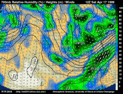 This panel shows the latest 700 mb field for geopotential height, winds, and dew point depression. 700 mb charts depict conditions in the middle troposphere (roughly 3000 meters). This is also referred to as the steering level, since most weather systems are "steered" by the winds at this level. Geopotential height approximates the actual height of a pressure surface above mean sea-level and is represented by the solid white contours. The geopotential height field is given in meters with an interval of 30 meters between height lines. The locations of surface cyclones and anticyclones hold similar positions in the 700 mb geopotential height field. Wind vectors indicate wind direction and wind speed and are drawn here as tiny white arrows. Wind vectors point towards the direction in which the wind is blowing and the longer the wind vector, the stronger the wind. The unit of magnitude for wind speed as depicted by the wind vectors is meters per second. Dew point depression is represented by the color filled regions and the associated values are indicated by the color code located in the lower left corner of the forecast panel. Dew point depression is defined as the difference between the dew point temperature and the actual temperature. Regions of moist air are identified by smaller dew point depression values, while greater values indicate drier air. The greater the dew point depression (more negative), the more moist the air, which is precursor for the development of clouds and precipitation.