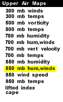 This panel shows the most recent 850 mb fields for geopotential height, dew point depression and wind vectors. 850 mb charts depict conditions in the lower troposphere (roughly 1500 meters). Geopotential height approximates the actual height of a pressure surface above mean sea-level and is represented by the solid white contours. The geopotential height field is given in meters with an interval of 30 meters between height lines. The locations of surface cyclones and anticyclones hold similar positions in the 850 mb geopotential height field. Wind vectors provide information about wind direction and wind speed and are drawn here as tiny white arrows. Wind vectors point towards the direction in which the wind is blowing and the longer the wind vector, the stronger the wind. The unit of magnitude for wind speed as depicted by the wind vectors is meters per second. Dew point depression, a measure of relative humidity, is represented by the color filled regions and the associated values are indicated by the color code located in the lower left corner of the forecast panel. Dew point depressions are given as the difference between the dew point temperatures and the actual temperatures. The lower the dew point depression, the more moist the air, which is vital for the development of clouds and precipitation. Advection of heat and moisture along the 850mb surface can be used to predict what will occur at the surface. Thermal advection can indicate forthcoming surface temperature changes, amplification of upper level troughs and ridges, and changes in pressure at the surface. Moisture advection is useful for predicting areas of precipitation.