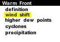 At the time this map was generated, temperatures ahead of the warm front were in the 40's, while behind the front, temperatures were only slightly warmer (in the 50's). However, notice the change in wind direction (as indicated by the wind barbs) from one side of the warm front to the other. Winds ahead of the warm front were generally from the east, while behind the front, winds had shifted around and were blowing out of the south. This sudden shift in wind direction was the key indicator that a warm front was present.