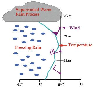 | . | Below is a sounding that typically results in freezing rain through Supercooled Warm Rain Processes (SWRP). Throughout the sounding profile, the temperature never exceeds 0C (32F). The process begins as supercooled raindrops grow by collision and coalescence, and since the temperature throughout the cloud is warmer than about -10C, the cloud is generally free of ice crystals. This is important because if ice crystals were present, the cloud drops would instead grow by ice crystal processes, producing snow and not freezing rain. Winds are typically out of the west or northwest at the surface, veering to the southwest in middle and upper levels.  In the second sounding, the temperature exceeds 0C (32F) above the cloud. This type of sounding is commonly observed in the Southern Plains where very warm mid-level air from the Mexican plateau overrides colder air in the surface layers. Winds at the surface are usually from the east or southeast and veer around to the southwest or west in middle and upper levels.  The best way to forecast freezing rain is to examine forecast model soundings for profiles similar to the ones described in this module. One web site providing these products is the Northern Illinois University's Storm Machine. One can choose the city and model and receive the appropriate forecast soundings, from which a forecast can be made about when and where freezing rain will occur.