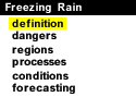 The diagram below shows a typical temperature profile for freezing rain with the red line indicating the atmosphere's temperature at any given altitude. The vertical line in the center of the diagram is the freezing line. Temperatures to the left of this line are below freezing, while temperatures to the right are above freezing. ![]() Freezing rain develops as falling snow encounters a layer of warm air deep enough for the snow to completely melt and become rain. As the rain continues to fall, it passes through a thin layer of cold air just above the surface and cools to a temperature below freezing. However, the drops themselves do not freeze, a phenomena called supercooling (or forming "supercooled drops"). When the supercooled drops strike the frozen ground (power lines, or tree branches), they instantly freeze, forming a thin film of ice, hence freezing rain.