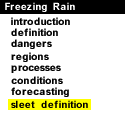 Sleet is less prevalent than freezing rain and it is defined as fronzen raindrops that bounce on impact with the ground or other objects. Sleet is more difficult to forecast than freezing rain because it is formed under more specialized atmospheric conditions. It is very similar to freezing rain in that it causes surfaces to become very slick and causes automobile accidents and falls. It is also different in that it is not clear as glass and can be easily seen. ![]() For sleet to fall the precipitation must begin as snow. Once the snow begins to fall it encounters a shallow layer of warm air and partially melts. The partially melted snow enters the deep cold layer it refreezes into an ice-pellet and becomes sleet.