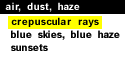 Crepuscular rays occur when objects such as mountain peaks or clouds partially shadow the sun's rays. The name crepuscular means "relating to twilight" and these rays are observed at sunrise and sunset. Crepuscular rays appear to diverge outward from the setting sun, and are visible only when the atmosphere contains enough haze or dust particles so that sunlight in unshadowed areas can be scattered toward the observer.