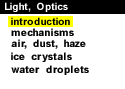 The type of optical effect that results greatly depends upon the type of particles the light encounters and on the wavelength of the light. For this reason, the optical effects discussed in this module have been grouped according to the following classifications of atmospheric particles: air, dust and haze, ice crystals, and water droplets. The navigation menu (left) for this module is called "Light, Optics" and the menu items are arranged in a recommended sequence, beginning with this introduction. In addition, this entire web server is accessible in both "graphics" and "text"-based modes, a feature controlled by the blue "User Interface" menu (located beneath the black navigation menus). More information about the user interface options, the navigation system, or WW2010 in general is accessible from About This Server.