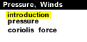 Graphic by: Yiqi Shao The weight of the air above an object exerts a force upon that object and this force is called pressure. Variations in pressure lead to the development of winds that influence our daily weather. The purpose of this module is to introduce pressure, how it changes with height and the importance of high and low pressure systems. In addition, this module introduces the pressure gradient and coriolis forces and their role in generating wind. The navigation menu (left) for this module is called "Pressure, Winds" and the menu items are arranged in a recommended sequence, beginning with this introduction. Click on the menu item of interest to go to that particular section. In addition, this entire web server is available in both a "graphics" and "text"-based mode and these options are accessible from the blue User Interface menu (left beneath the black navigation menus). More details about the navigation system, the user interface options or the WW2010 web server in general are available from About This Server.