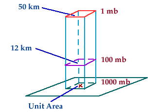 | . | The pressure at any level in the atmosphere may be interpreted as the total weight of the air above a unit area at any elevation. At higher elevations, there are fewer air molecules above a given surface than a similar surface at lower levels. For example, there are fewer molecules above the 50 km surface than are found above the 12 km surface, which is why the pressure is less at 50 km.