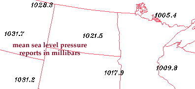 Sea level pressure reports are available every hour, which means that maps of isobars are likewise available every hour. The solid blue contours (in the map below) are isobars and the numbers along particular contours indicate the pressure value of the isobar.