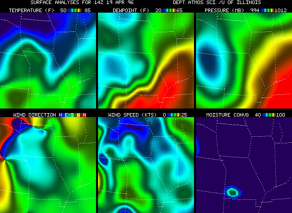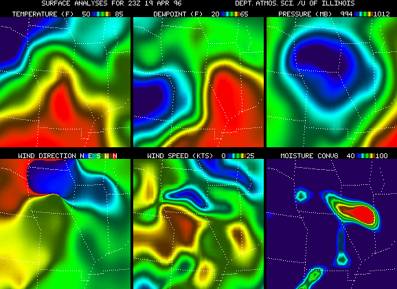 The meteorological fields displayed in the six-panel images include Temperature, Dew Point Temperature and Pressure, Wind Direction, Wind Speed and Moisture Convergence. The images are accessible through the links provided below. April 19, 1996 1912, 1913, 1914, 1915, 1916, 1917 1918, 1919, 1920, 1921, 1922, 1923