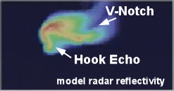 In this modeled radar image, both are evident. A hook echo is a strong signal