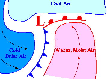 ![]() Clouds and precipitation usually develop along and ahead of the warm front as warm moist air rides up and over the colder air ahead of it.
